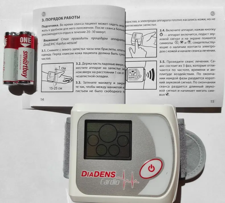 ДиаДЭНС-Кардио (Евро) модель 2013г. ДиаДЭНС-Кардио — аппарат для курсового воздействия на биологически активные зоны с целью коррекции артериального давления (АД) и нормализации общего состояния организма. Устройство воздействует на биологически активную точку, расположенную на запястье, импульсом электрического тока низкой частоты. ДиаДЭНС-Кардио с одной автоматизированной лечебной программой способствует нормализации тонуса сосудистой стенки, расширения капилляров, улучшения гемодинамики в системе микроциркуляции. За счет этого: